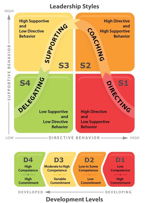 The top of the model illustrates the four leadership styles – Style 1 (Directing), Style 2 (Coaching), Style 3 (Supporting), and Style 4 (Delegating). These leadership styles correspond to the four development levels – D1, D2, D3, and D4 – shown at the bottom of the model.