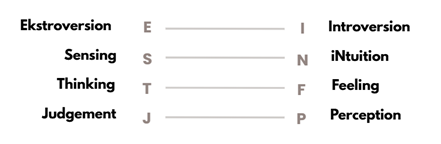 The somewhat oddly placed capital letters in iNtuition and oPfattelse, and the “missing” J in Judgement, are due to the Danish adaptation of the terms: Judgement = J, Perception (oPfattelse) = P, and iNtuition = N. N is chosen to avoid confusion with Introversion = I.