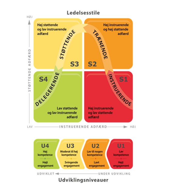 Se de fire ledelsesstile i tabellen neden for, samt i hvilken relation de benyttes. De fire ledelsesstile kaldes S1-4, på samme måde som udviklingsniveauerne kaldes U1-4.